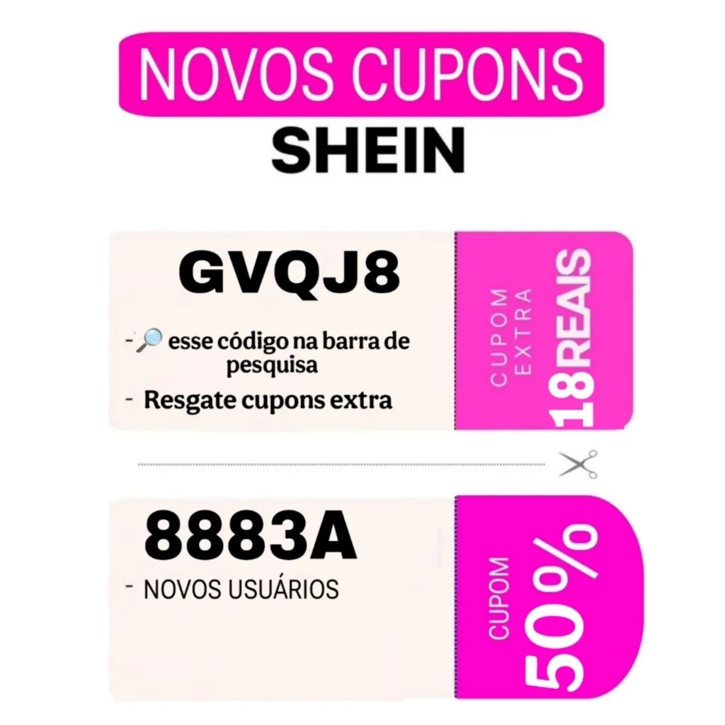 Além disso, usuários cadastrados no aplicativo da SHEIN frequentemente recebem cupons exclusivos via notificação, e novos clientes podem ganhar descontos extras no primeiro pedido.